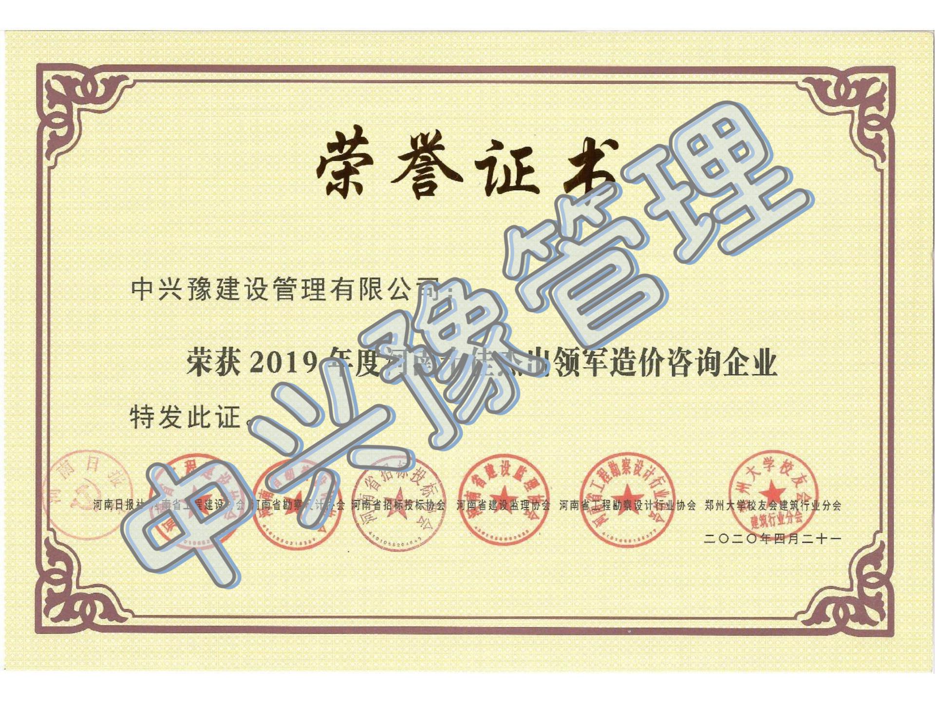 2019年度河南十佳杰出領(lǐng)軍造價(jià)咨詢(xún)企業(yè)-公司榮譽(yù)