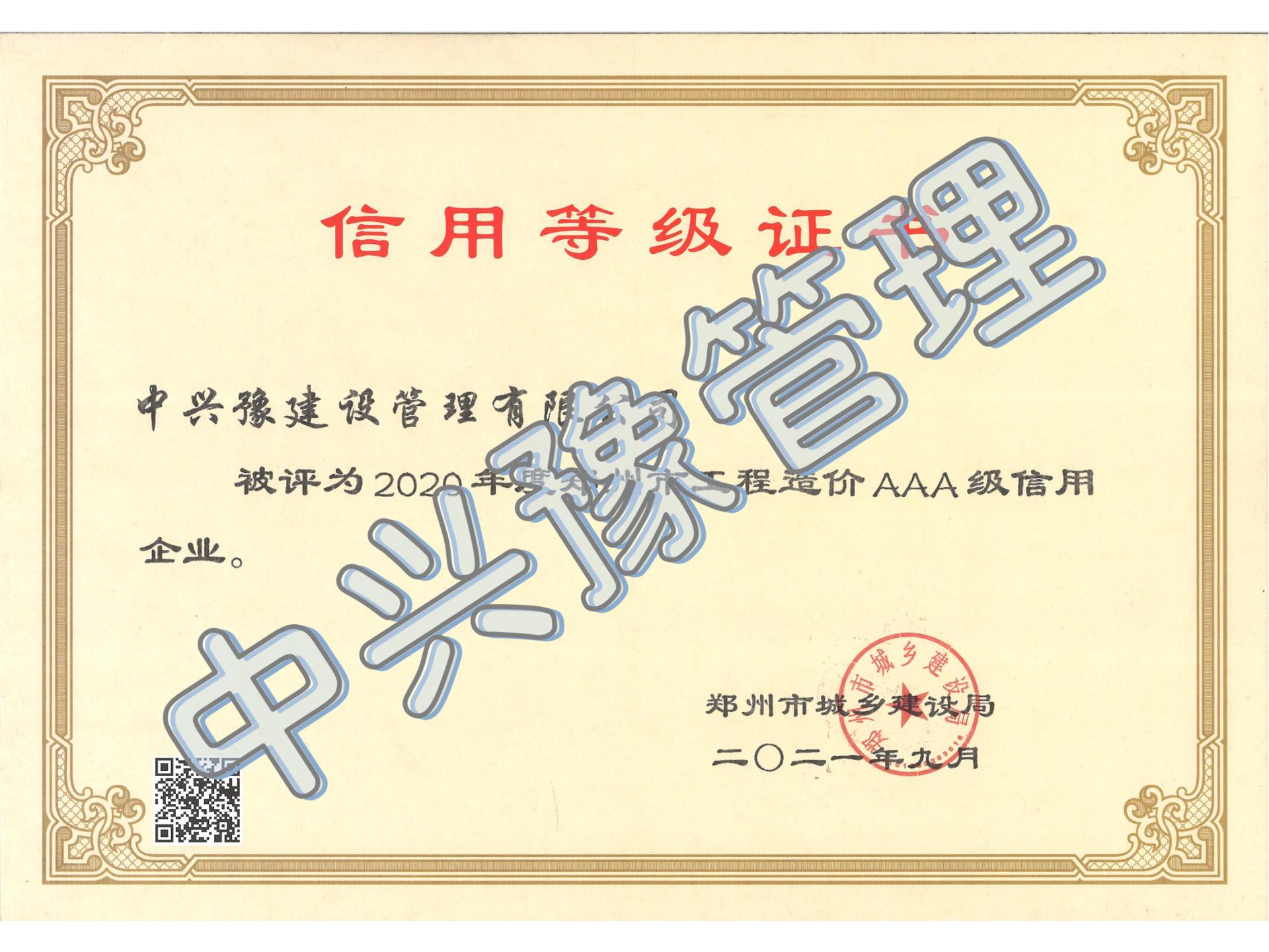 2020年度工程造價AAA信用等級評價-公司榮譽(yù)