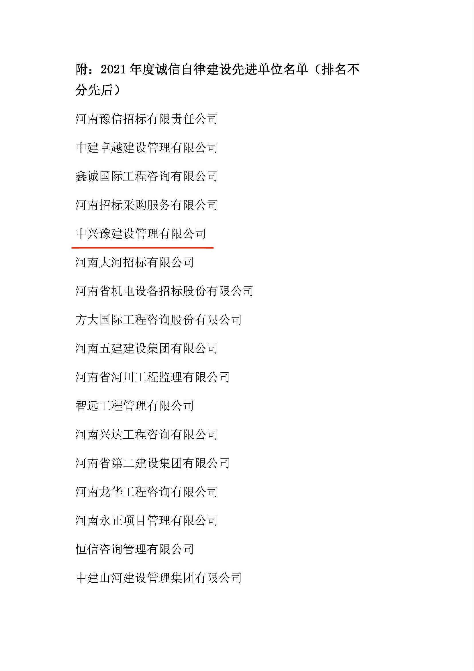 2022年3月21日,河南省招標投標協(xié)會發(fā)布了《關(guān)于表彰2021年度河南省招標投標誠信自律建設(shè)先進單位的決定》,中興豫建設(shè)管理有限公司再次榮獲“河南省招標投標誠信自律建設(shè)先進單位”榮譽稱號。