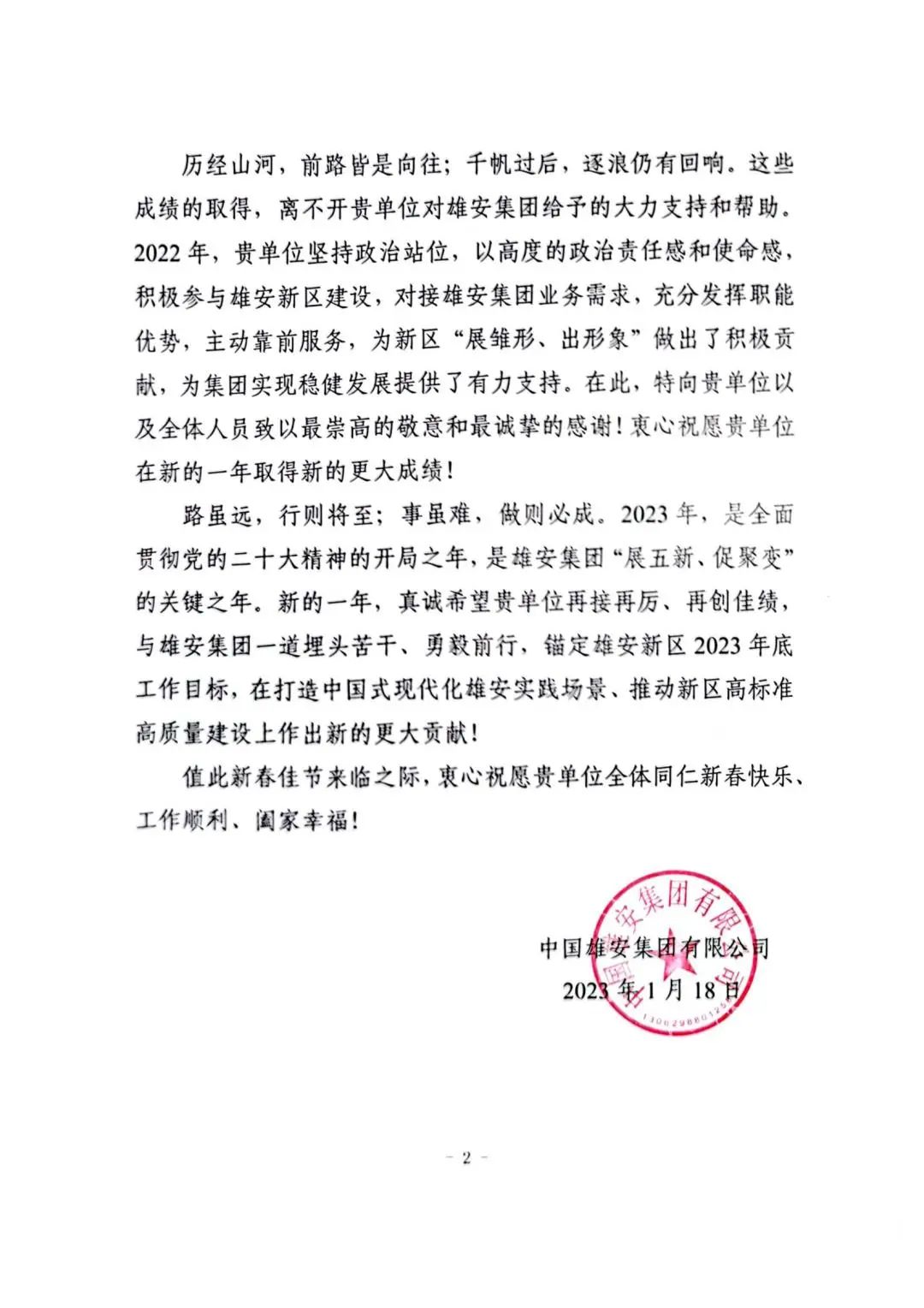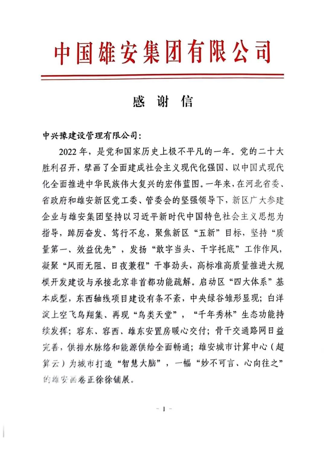 日前,中國雄安集團(tuán)有限公司向中興豫建設(shè)管理有限公司發(fā)來感謝信,對我公司工作表示感謝。一封感謝信,字字鼓人心!這封熱情洋溢的感謝信,字里行間體現(xiàn)著雄安集團(tuán)對我公司主動作為,勇?lián)姑?、攻堅克難和甘于奉獻(xiàn)的崇高敬意,對項目團(tuán)隊保質(zhì)保量完成工作目標(biāo)給予的充分認(rèn)可和高度贊譽(yù)。