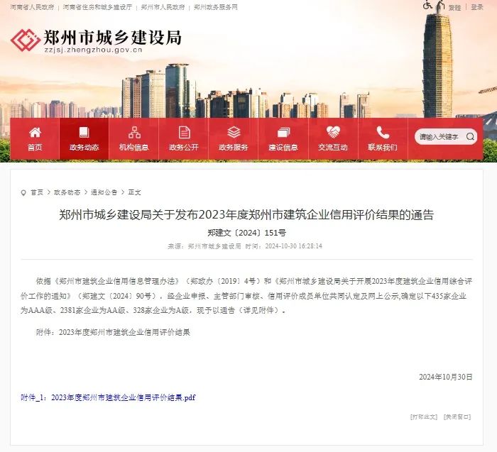 近日,鄭州市城鄉(xiāng)建設(shè)局關(guān)于2023年度鄭州市建筑企業(yè)信用評價審核結(jié)果的公告,中興豫建設(shè)管理有限公司榮獲