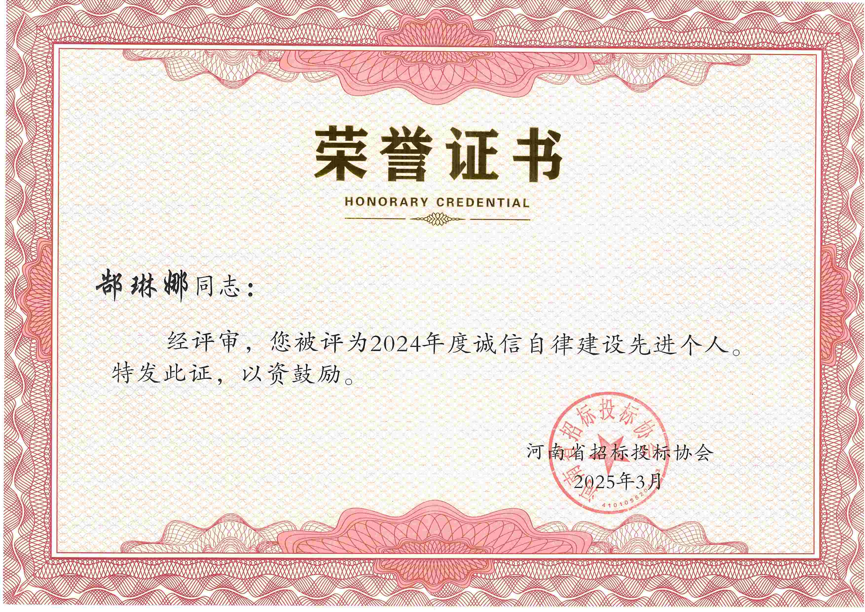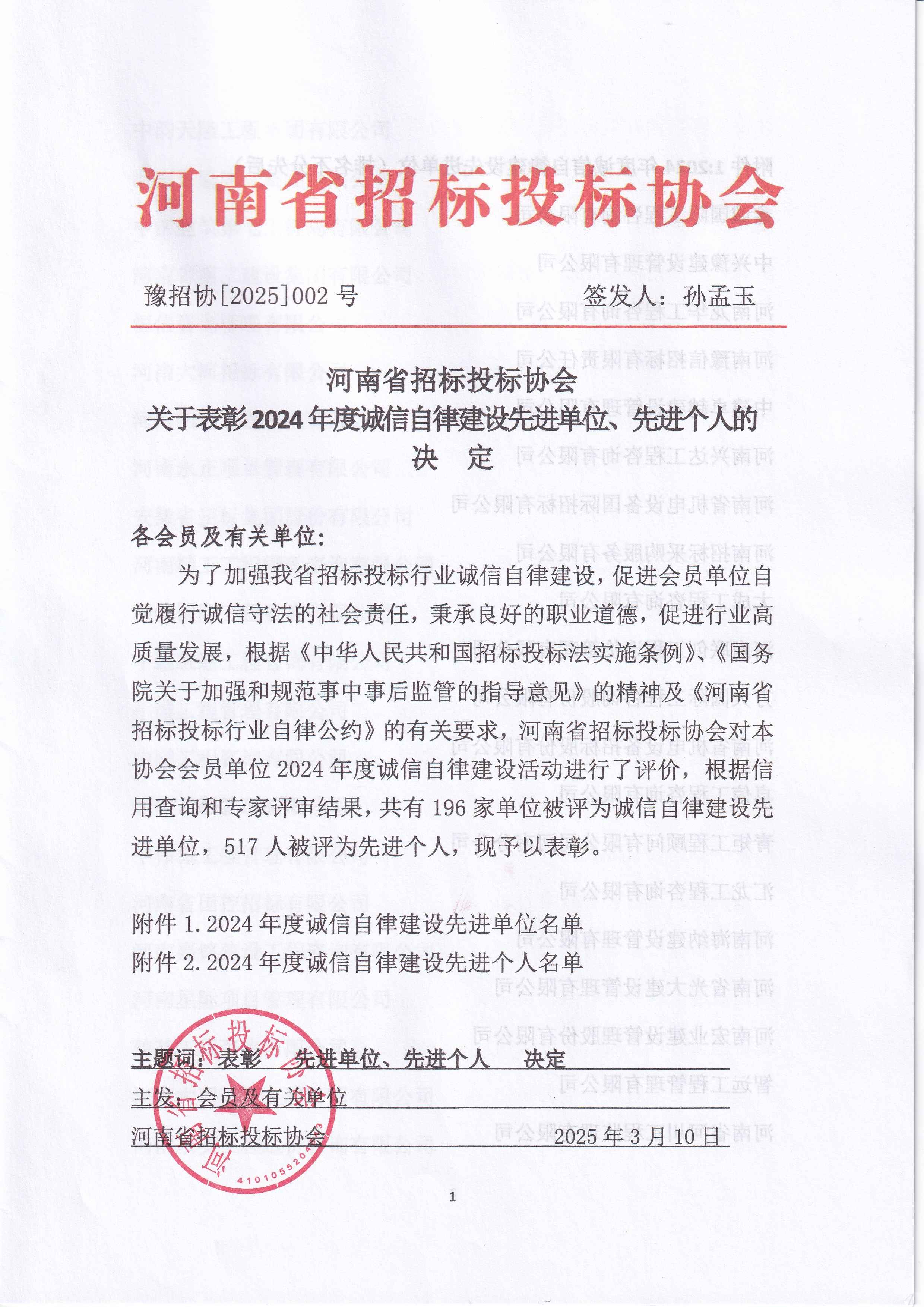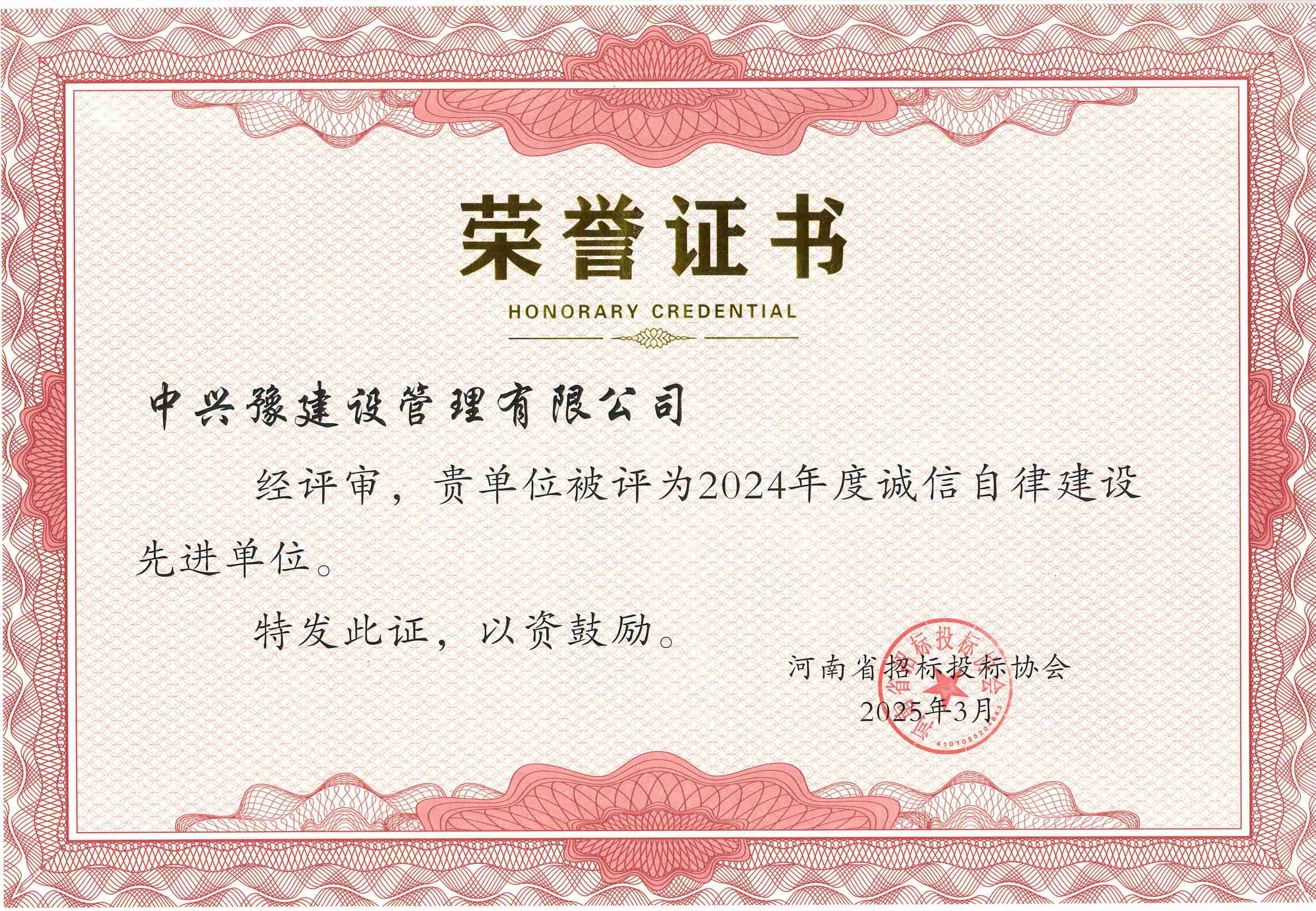 近日,河南省招標(biāo)投標(biāo)協(xié)會發(fā)布關(guān)于表彰2024年度誠信自律建設(shè)先進(jìn)單位、先進(jìn)個人的決定。其中,中興豫建設(shè)管理有限公司榮幸入選“2024年度誠信自律建設(shè)先進(jìn)單位”。