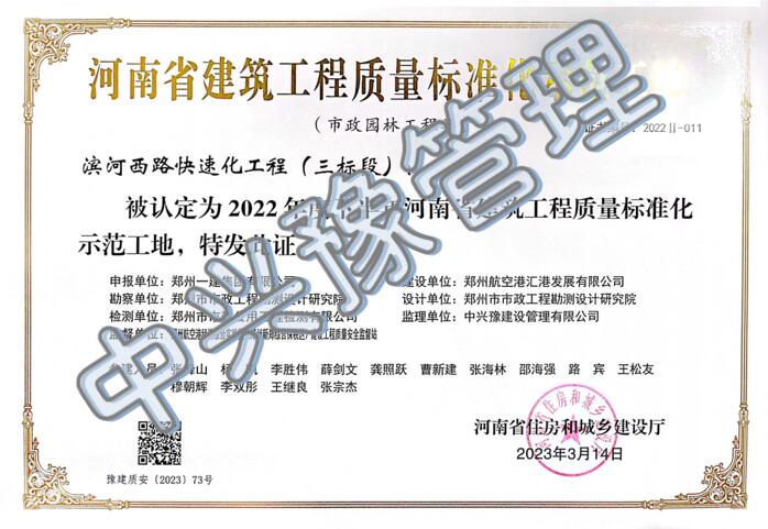 近日,我公司監(jiān)理的常綠林溪上苑(6#樓、7#樓、8#樓、9#樓)項目榮獲“2022年度下半年河南省建筑工程質(zhì)量標準化示范工地”及“河南省優(yōu)質(zhì)結(jié)構(gòu)工程”榮譽稱號;林州碧桂園林語印象項目榮獲“2022年度下半年河南省建筑工程質(zhì)量標準化示范工地”榮譽稱號;濱河西路快速化工程(三標段)項目榮獲“2022年度下半年河南省建筑工程質(zhì)量標準化示范工地”榮譽稱號。