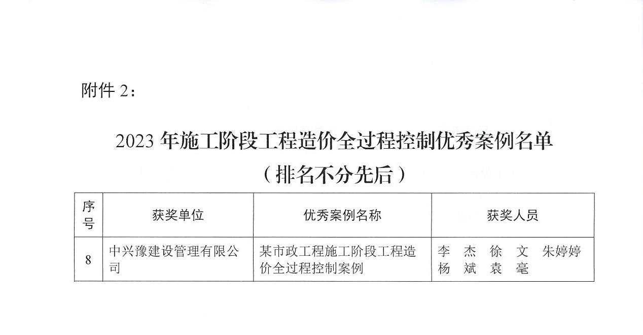10月30日,10月30日,河南省注冊(cè)造價(jià)工程師協(xié)會(huì)公布了“河南省注冊(cè)造價(jià)工程師協(xié)會(huì)2023年工程造價(jià)優(yōu)秀案例公示的通知”,由中興豫建設(shè)管理有限公司負(fù)責(zé)的“某市政工程施工階段工程造價(jià)全過程控制案例”項(xiàng)目榜上有名。