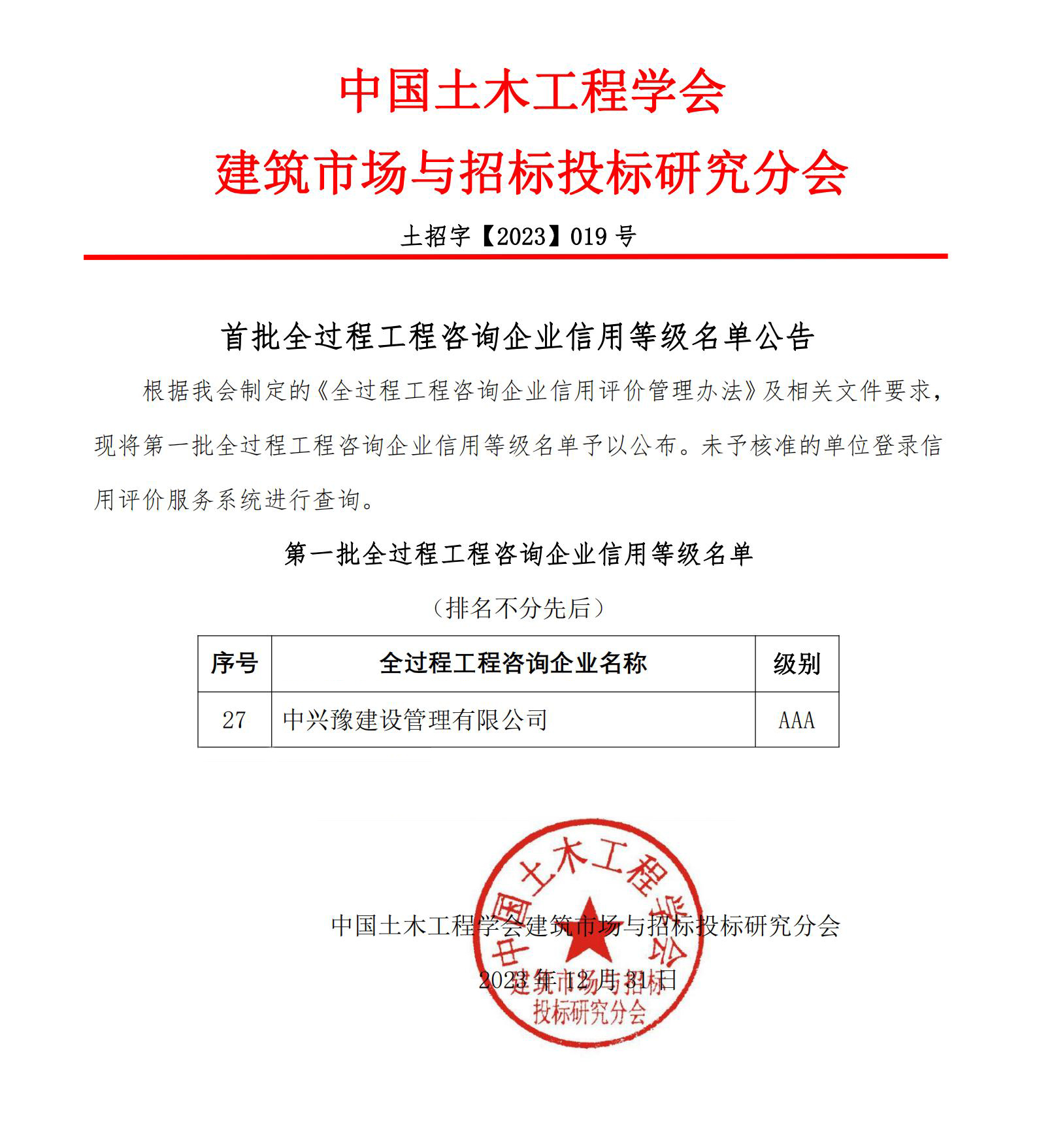 近日,中興豫建設(shè)管理有限公司獲評(píng)中國土木工程學(xué)會(huì)建筑市場(chǎng)與招標(biāo)投標(biāo)研究分會(huì)“首批全過程工程咨詢企業(yè)信用等級(jí)評(píng)價(jià)AAA企業(yè)”,成為河南省內(nèi)唯一首批獲得該信用評(píng)價(jià)等級(jí)的全過程工程咨詢企業(yè)。