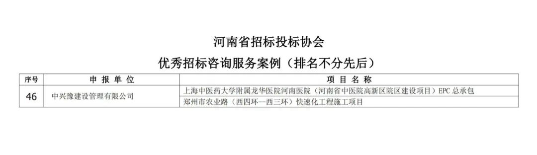 近日,河南省招標(biāo)投標(biāo)協(xié)會公布了“關(guān)于優(yōu)秀招標(biāo)咨詢服務(wù)案例并對優(yōu)秀案例申報單位進行表彰的決定”。經(jīng)專家評審,中興豫建設(shè)管理有限公司入選其中,兩項工程被評為優(yōu)秀招標(biāo)咨詢服務(wù)案例。