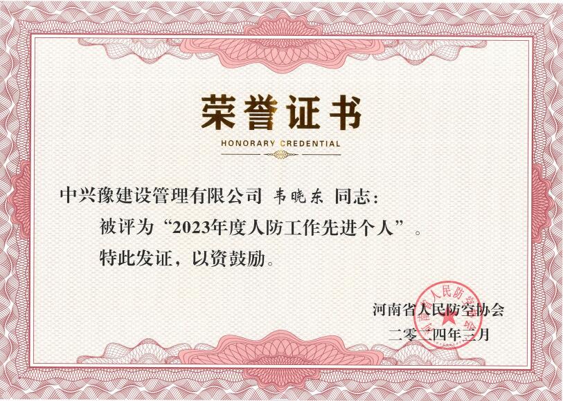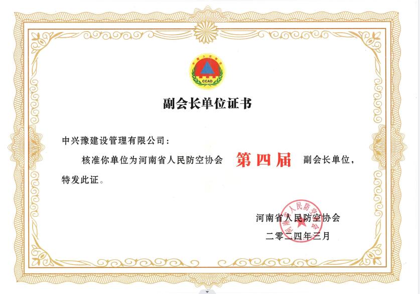近日,河南省人民防空協(xié)會頒發(fā)了關于優(yōu)秀會員單位及先進工作者的榮譽證書,我公司核準為河南省人民防空協(xié)會第四屆副會長單位、2023年度人防行業(yè)先進單位,工程監(jiān)理中心總經(jīng)理韋曉東榮獲2023年度人防工作先進個人榮譽稱號。