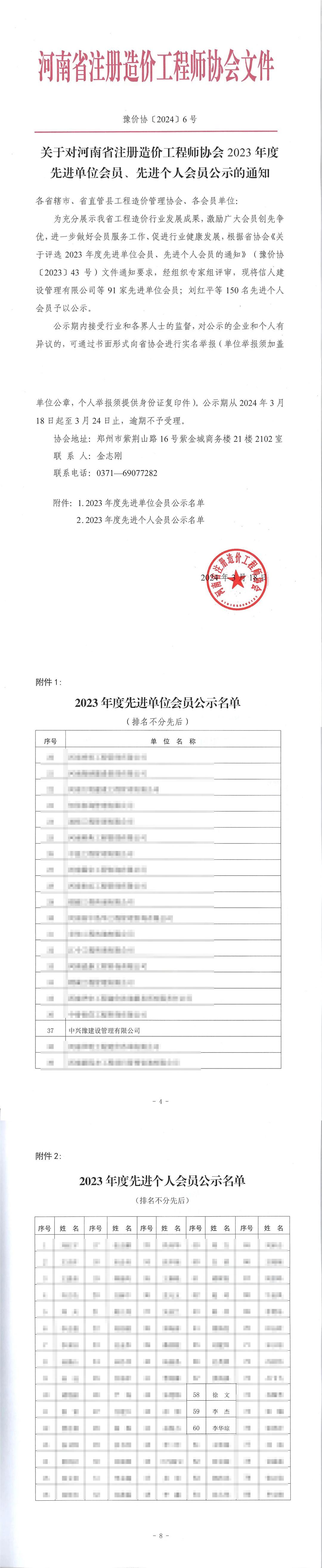近日,河南省注冊(cè)造價(jià)工程師協(xié)會(huì)公布了《關(guān)于對(duì)河南省注冊(cè)造價(jià)工程師協(xié)會(huì)2023年度先進(jìn)單位會(huì)員、先進(jìn)個(gè)人會(huì)員公示的通知》,中興豫建設(shè)管理有限公司榮獲2023年度先進(jìn)單位會(huì)員,徐文、李杰、李華瓊榮獲2023年度先進(jìn)個(gè)人會(huì)員榮譽(yù)稱(chēng)號(hào)!