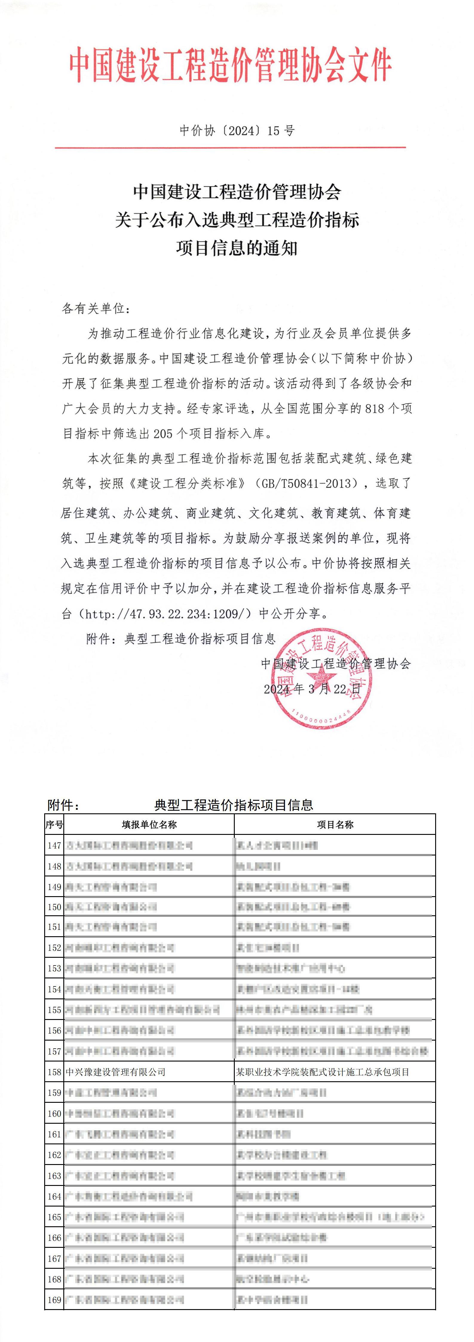 近日,中國建設(shè)工程造價(jià)管理協(xié)會關(guān)于公布入選典型工程造價(jià)指標(biāo)項(xiàng)目信息的通知中,我公司的“某職業(yè)技術(shù)學(xué)院裝配式設(shè)計(jì)施工總承包項(xiàng)目"作為典型項(xiàng)目入選其中。