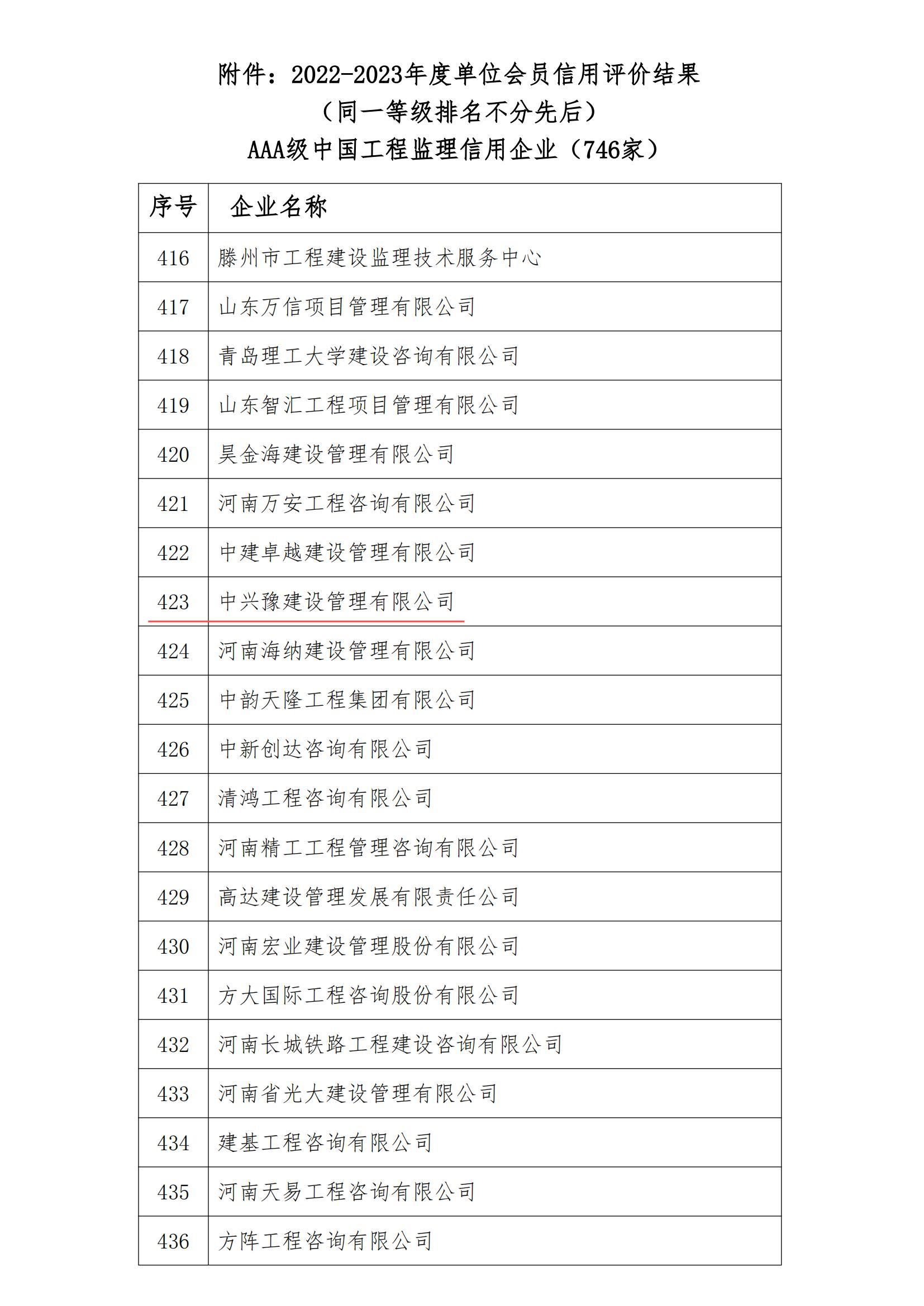 近日,中國建設(shè)監(jiān)理協(xié)會(huì)發(fā)布了《關(guān)于2022-2023年度中國建設(shè)監(jiān)理協(xié)會(huì)單位會(huì)員信用評(píng)價(jià)結(jié)果的公示》,經(jīng)自評(píng)、省級(jí)協(xié)會(huì)初評(píng)、專家評(píng)委綜合評(píng)審、公示、反饋、專家復(fù)核等評(píng)價(jià)程序,中興豫建設(shè)管理有限公司榮獲中國工程監(jiān)理信用評(píng)價(jià)AAA級(jí)企業(yè)!