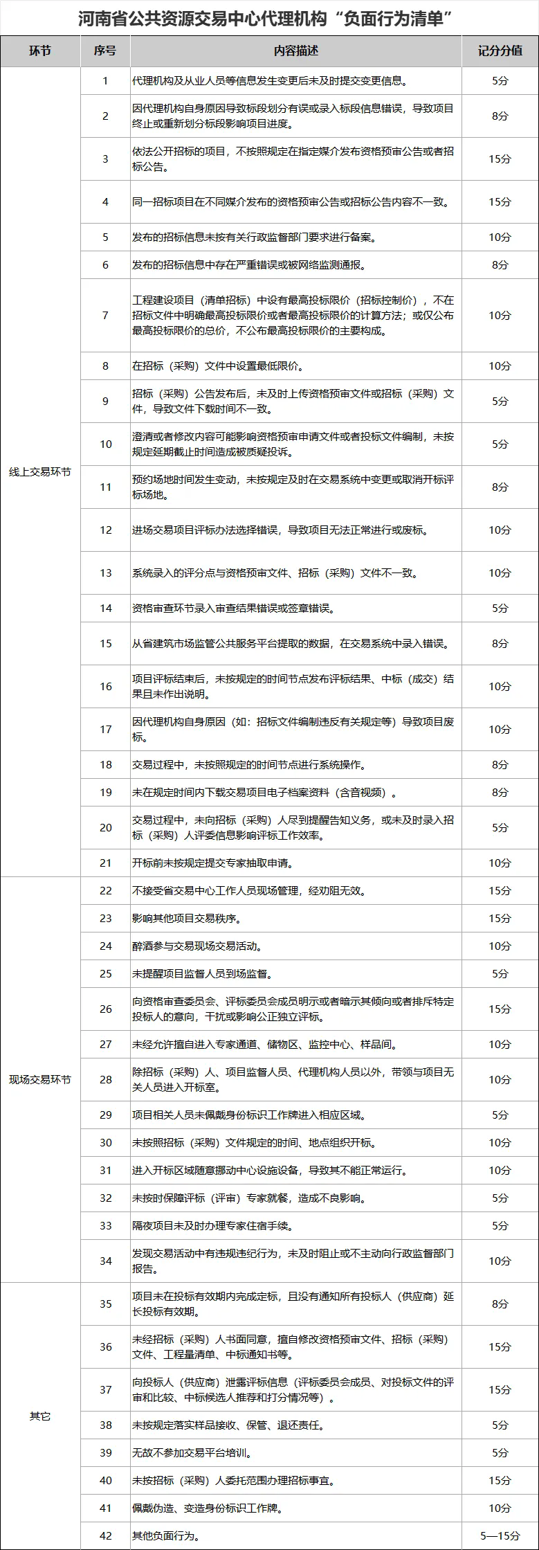 河南省公共資源交易中心建立代理機(jī)構(gòu)負(fù)面行為管理機(jī)制,負(fù)責(zé)對其負(fù)面行為進(jìn)行記錄、核實(shí),并書面通知代理機(jī)構(gòu)。代理機(jī)構(gòu)對通知內(nèi)容有異議的,可在通知之日起5個工作日內(nèi)提出書面申請,經(jīng)查實(shí)屬于記分不當(dāng)?shù)?,予以修正。?shí)施負(fù)面行為清單采用動態(tài)管理。每個周期內(nèi),累計(jì)達(dá)到20分的,采取約談提醒方式督促其規(guī)范進(jìn)場交易行為;累計(jì)達(dá)到30分的,暫停3個月進(jìn)場交易;累計(jì)達(dá)到50分的,暫停6個月進(jìn)場交易。