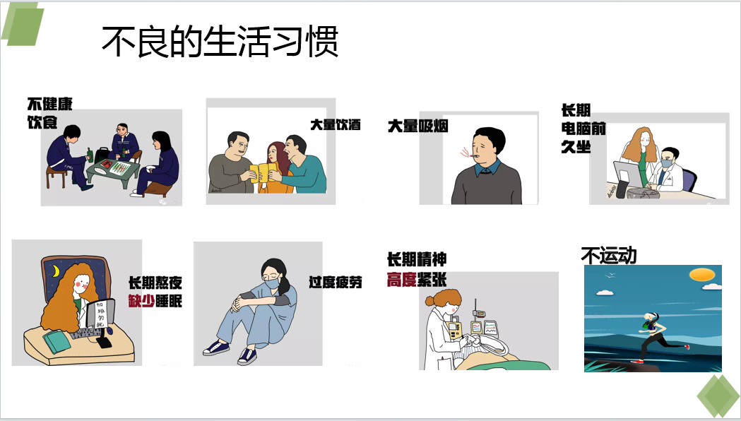 由于現(xiàn)今社會(huì)工作壓力大,生活節(jié)奏快等原因,人們?cè)谏钪写嬖谝韵虏涣忌盍?xí)慣:不健康飲食、大量飲酒、大量吸煙、長(zhǎng)期電腦前久坐、長(zhǎng)期熬夜缺少睡眠、過(guò)度疲勞、長(zhǎng)期精神高度緊張、缺乏運(yùn)動(dòng)等。這些不良生活習(xí)慣會(huì)導(dǎo)致人們的身體長(zhǎng)期處于“亞健康”狀態(tài),從而誘發(fā)一些慢性疾病。現(xiàn)今“三高”等慢性疾病呈年輕化趨勢(shì),與這些不良生活習(xí)慣脫不了干系。