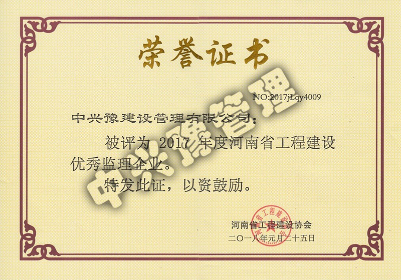 2017年度河南省優(yōu)秀監(jiān)理企業(yè)-公司榮譽