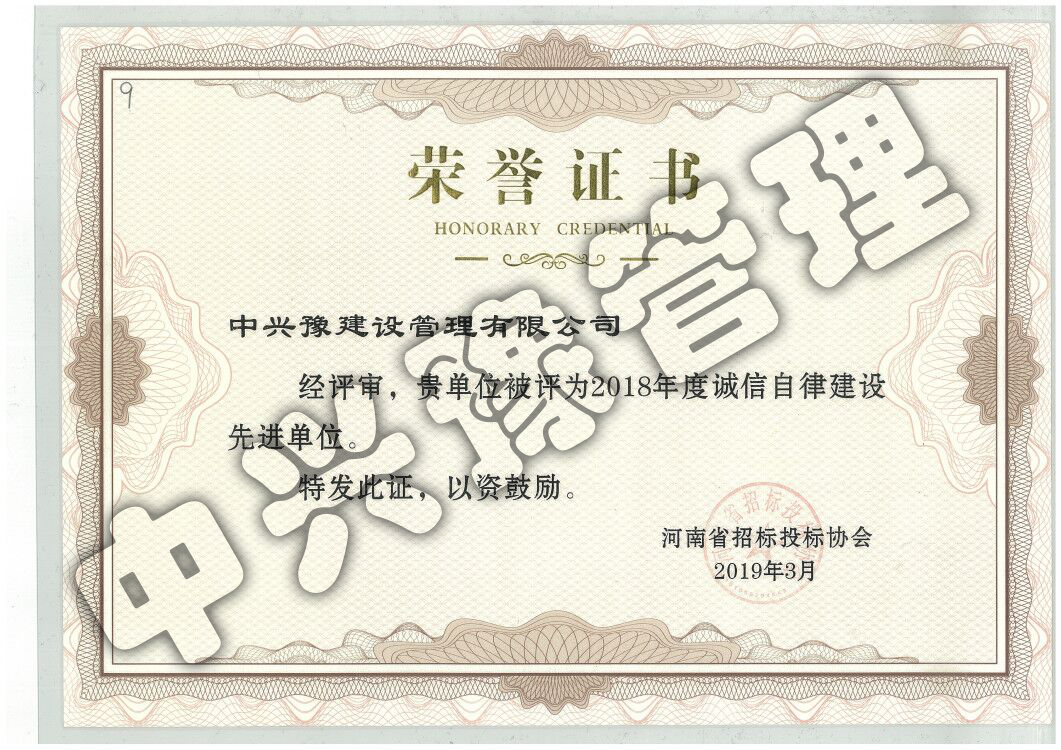 2018年度誠(chéng)信自律建設(shè)先進(jìn)單位-公司榮譽(yù)